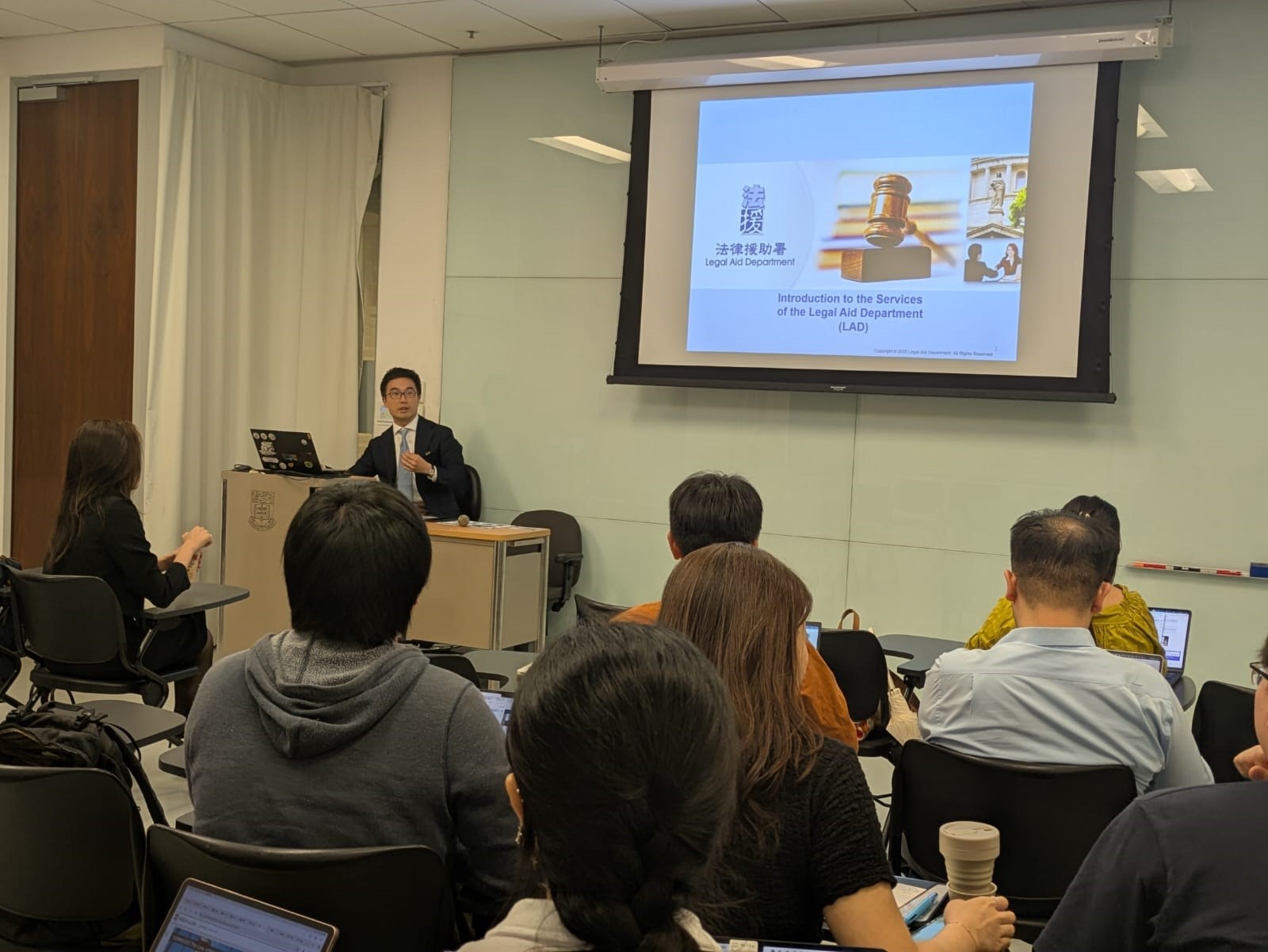 二零二五年八月十九日,署理高級法律援助律師(申請及審查)楊名瀚應香港大學社會科學學院邀請出席講座,向一羣社會工作系學生講述法援署各方面的工作和服務。