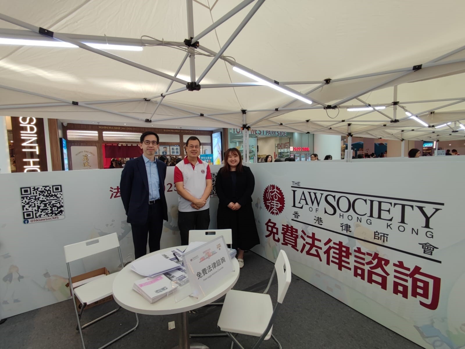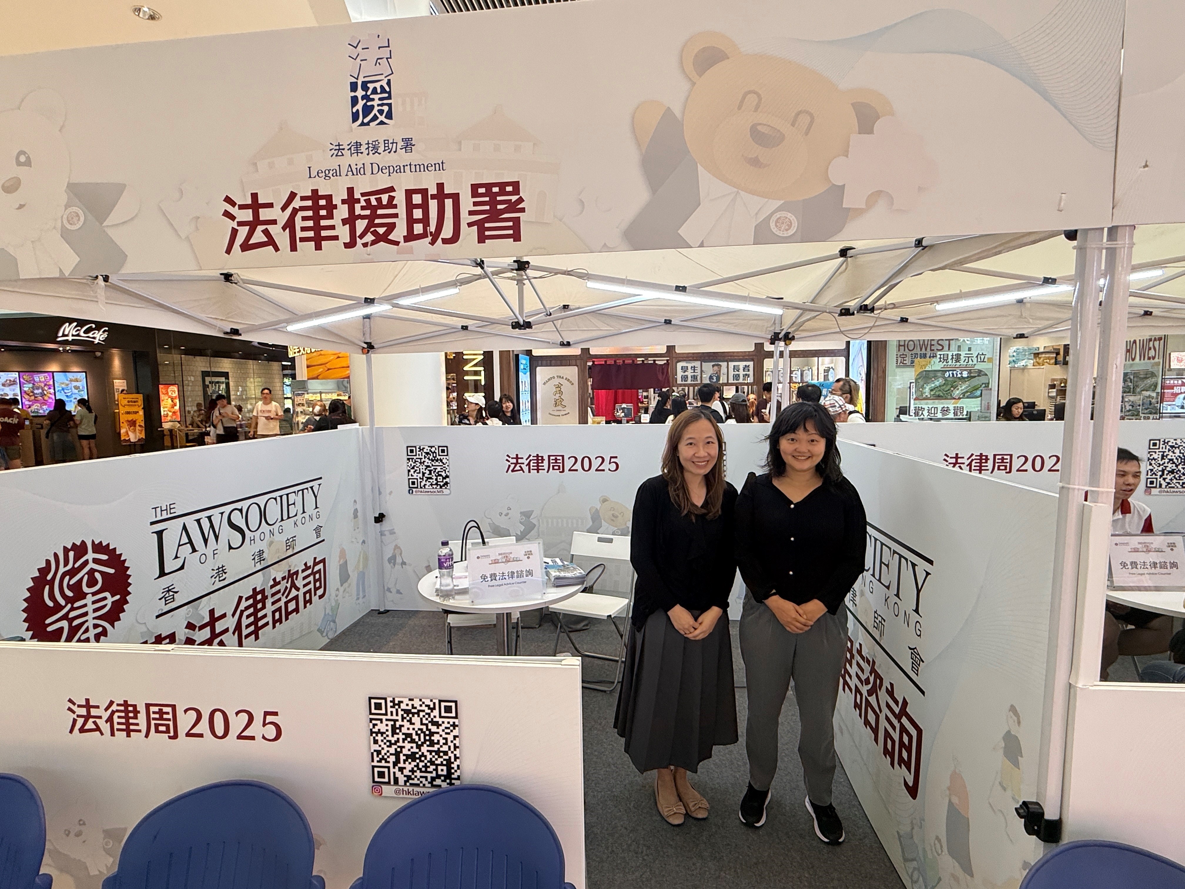 二零二五年九月十四日,香港律師會在天水圍舉辦主題為「法治連線‧共建未來」的法律周2025開幕典禮,法律援助署署長莊因東(禮台右四)擔任主禮嘉賓。法援署同事踴躍參與當日的首場「免費法律諮詢服務」活動,為市民提供法援服務的資訊及解答查詢。