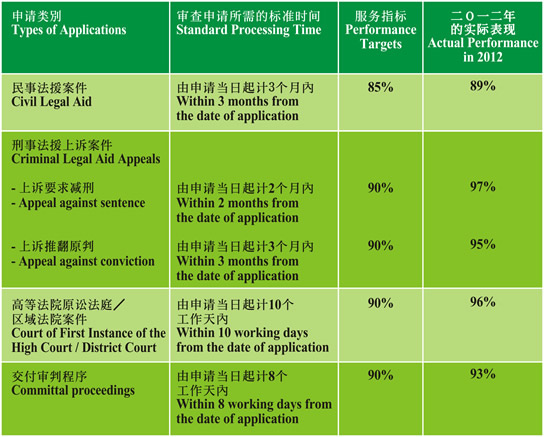 在二〇一二年,本署审查各项申请的实际表现,均超出服务承诺订立的审查时间指标。
