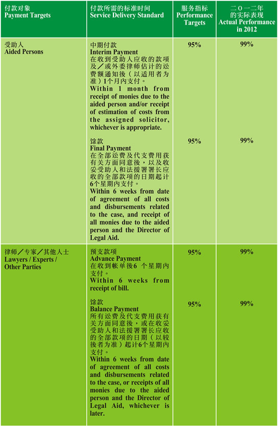 在二〇一二至一三財政年度,本署向律师/专家/其他人士支付的费用为5.13亿元,而向法援受助人支付的款项则为7.97亿元。年内,各项付款服务的表现均超出所订的服务承诺,详情如下: